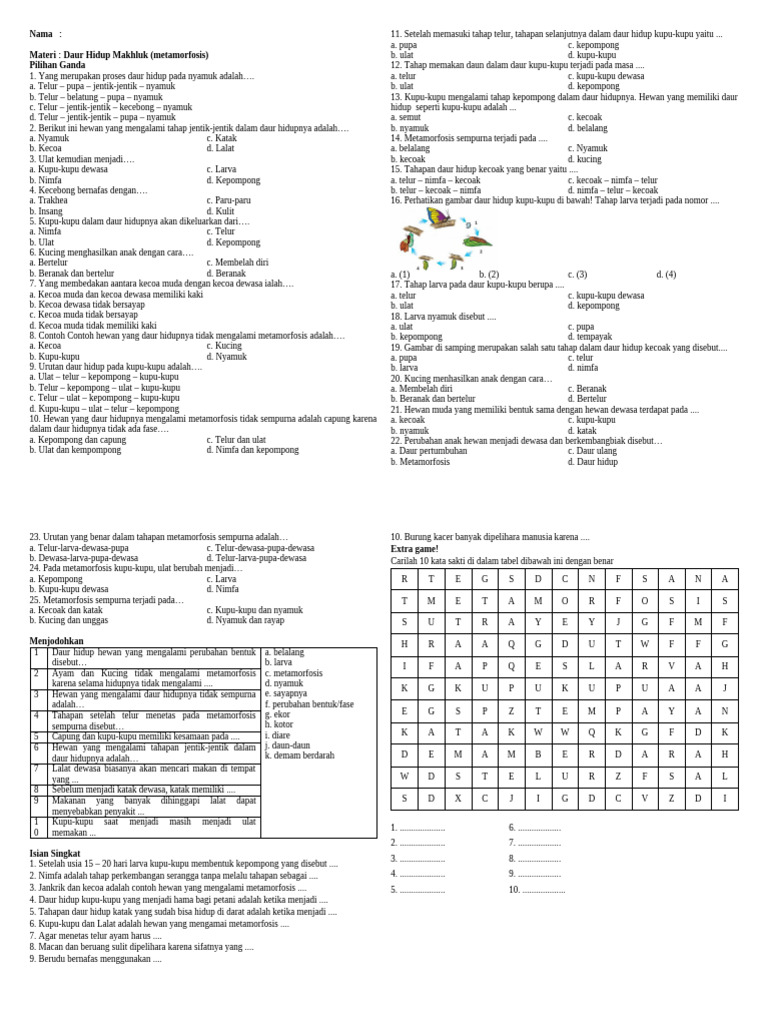 Metamorfosis adalah salah satu keajaiban alam yang paling memukau. Ia menggambarkan proses perubahan bentuk tubuh yang dialami oleh hewan tertentu dari tahap awal kehidupan hingga dewasa. Bagi siswa kelas 4 Sekolah Dasar, memahami konsep metamorfosis bukan hanya sekadar menghafal fakta, tetapi juga merangsang rasa ingin tahu, observasi, dan apresiasi terhadap keragaman hayati. Artikel ini akan menyajikan kumpulan soal yang dirancang khusus untuk membantu siswa kelas 4 SD menguasai materi metamorfosis, lengkap dengan penjelasan mendalam dan tips menjawab.
