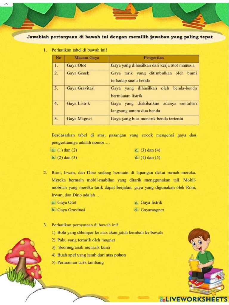 Artikel ini akan mengajakmu menjelajahi dunia gaya melalui kumpulan soal latihan yang dirancang khusus untuk siswa kelas 4 SD. Soal-soal ini tidak hanya menguji pemahaman teoritis, tetapi juga mendorong siswa untuk berpikir kritis dan mengaitkan konsep gaya dengan fenomena yang mereka temui dalam kehidupan sehari-hari. Dengan latihan yang tepat, materi gaya yang mungkin terasa abstrak akan menjadi lebih mudah dipahami dan menyenangkan.